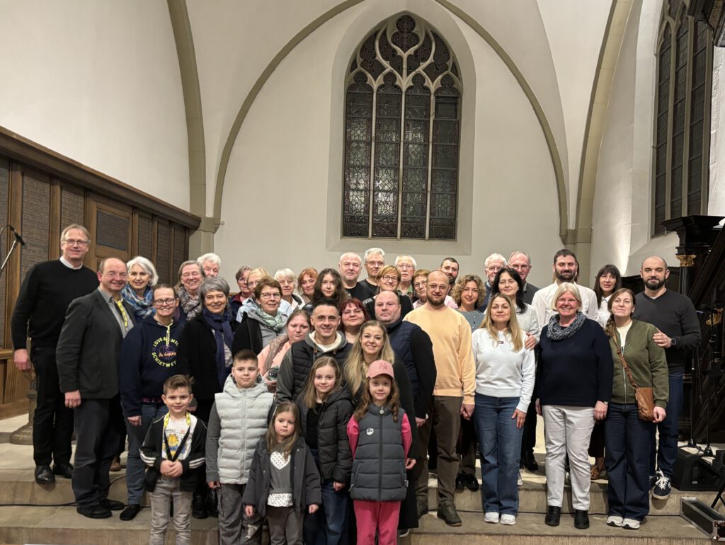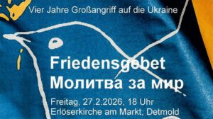 Seit mehr als 40 Jahren gestaltet eine Initiative jeden Freitagabend um 18 Uhr in der Erlöserkirche am Markt ein Friedensgebet. Gern beteiligt sich die Chorgemeinschaft cantus novus hin und wieder, so auch an diesem Freitag, der dem Gedenken des Kriegsausbruchs in der Ukraine vor vier Jahren gewidmet war. Mitglieder einer russisch-ukrainischen Glaubensgemeinschaft aus Lemgo haben den Abend durch eigene Beiträge und Gebete mitgestaltet.